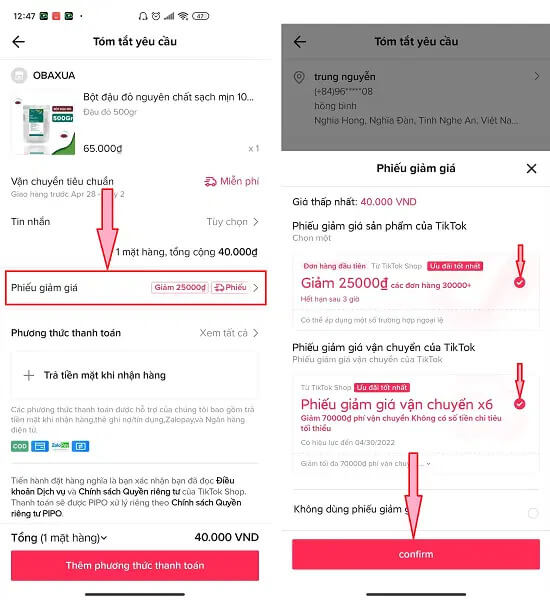 - Bước 5: Chọn và nhập mã giảm giá ở thanh Phiếu giảm giá. Kế đến chọn phương thức thanh toán và kiểm tra đơn hàng thật kỹ một lần nữa.