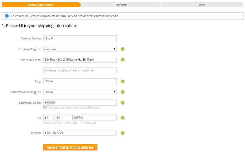 Sau khi chọn được sản phẩm ưng ý, bạn hãy điền đầy đủ thông tin nhận hàng để AliExpress giao hàng đầy đủ cho bạn. Các thông tin bao gồm: