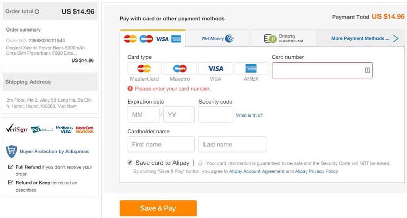 Trên AliExpress có 2 hình thức thanh toán khả dụng là thanh toán bằng Alipay và thanh toán bằng thẻ ghi nợ/thẻ quốc tế. Với các khách hàng Việt Nam, thông thường mọi người sẽ sử dụng hình thức thứ 2. Để thanh toán, mọi người cần điền đầy đủ thông tin về thẻ Visa/Mastercard của mình: