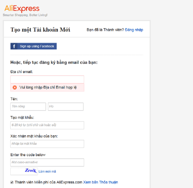 Truy cập vào www.aliexpress.com, ở góc phải giao diện trang, bấm chọn “Đăng ký” – Join Free để tạo tài khoản. AliExpress cho phép đăng ký bằng địa chỉ email và miễn phí đăng ký. Bạn chỉ cần gõ địa chỉ email, tên đăng nhập, password và nhập mã bảo vệ để tạo tài khoản.