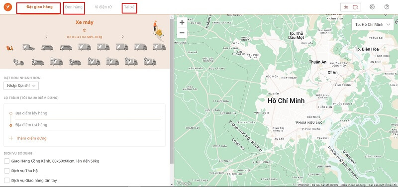 - Bước 1 Điền thông tin giao, nhận hàng, loại hình dịch vụ và các dịch vụ đi kèm